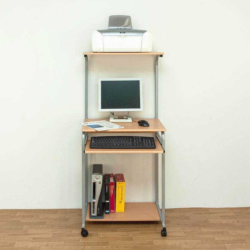 プリンターなどは上段の棚に、キーボードはスライドテーブルに、小物やソフトは下段の棚などに収納できます