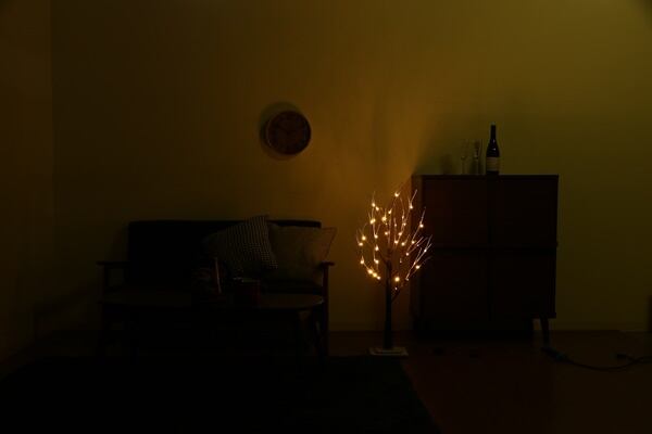 枝の先端に灯るLEDライトは、温かみのある色合いの光で周囲を照らし、幻想的な空間を作り出します。