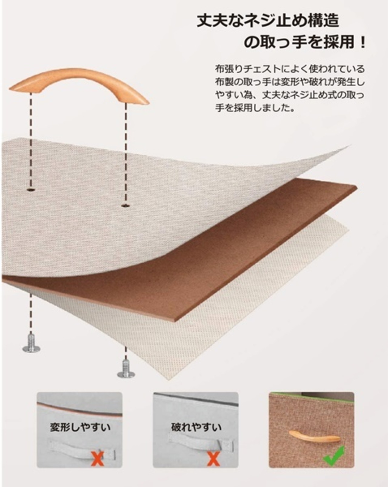 布製の取っ手は変形や破れが発生しやすいため、丈夫なネジ止め式の取っ手を採用。